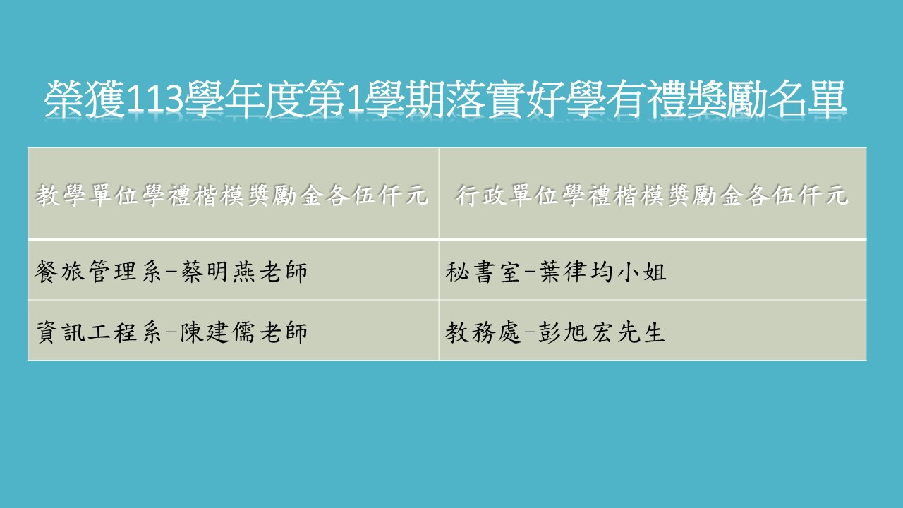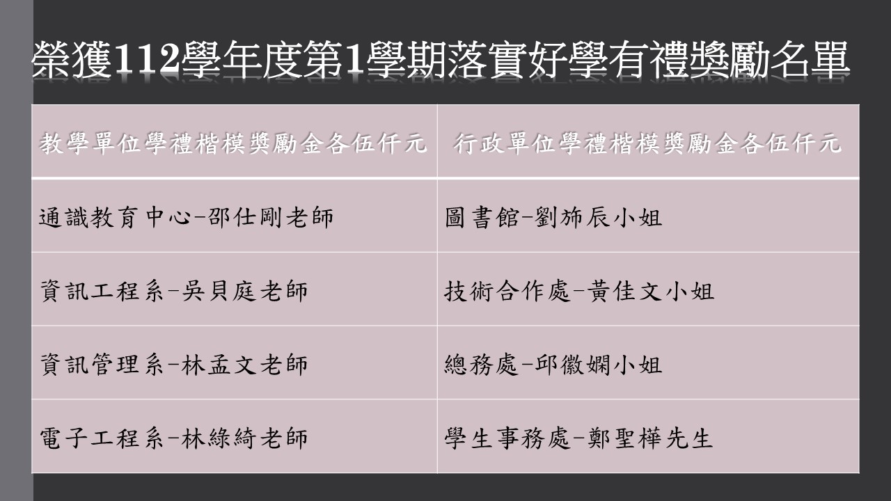 榮獲111學年度第1學期落實好學有禮獎勵名單